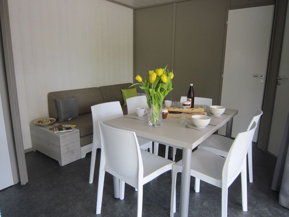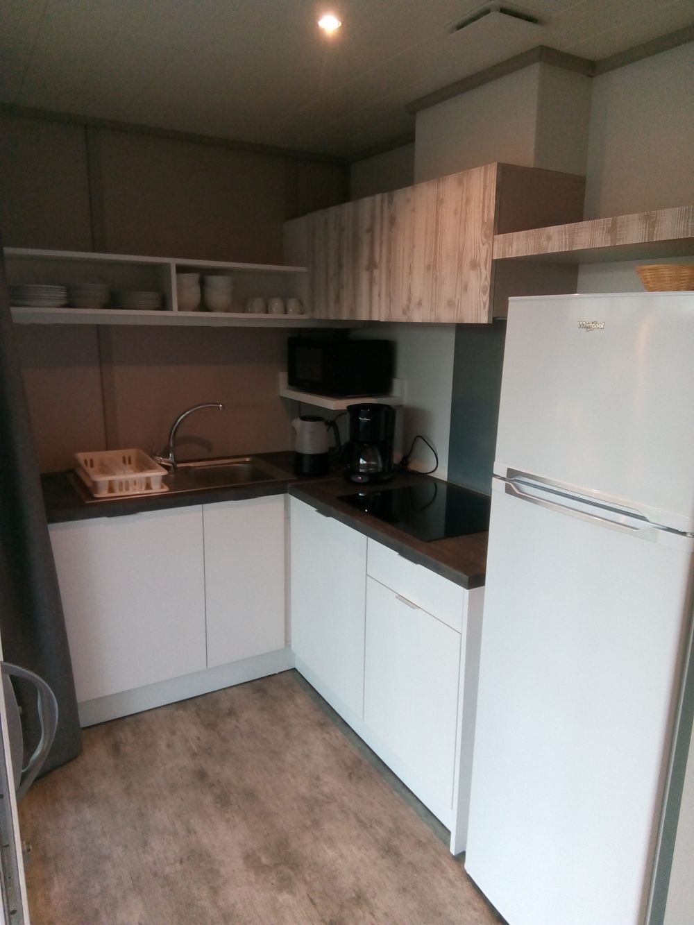 Une pièce de vie avec un canapé-lit convertible (140x190), TV, une clim réversible, un coin repas avec une table (8 personnes) et 8 chaises, un coin cuisine avec un réfrigérateur, un congélateur, une plaque de cuisson, une hotte, une bouilloire, un micro-onde, une cafetière (à filtres), un évier avec eau chaude, la vaisselle et les ustensiles de cuisine, des placards pour ranger les denrées alimentaires, de grandes baies vitrées coulissantes séparant la cuisine de la terrasse.